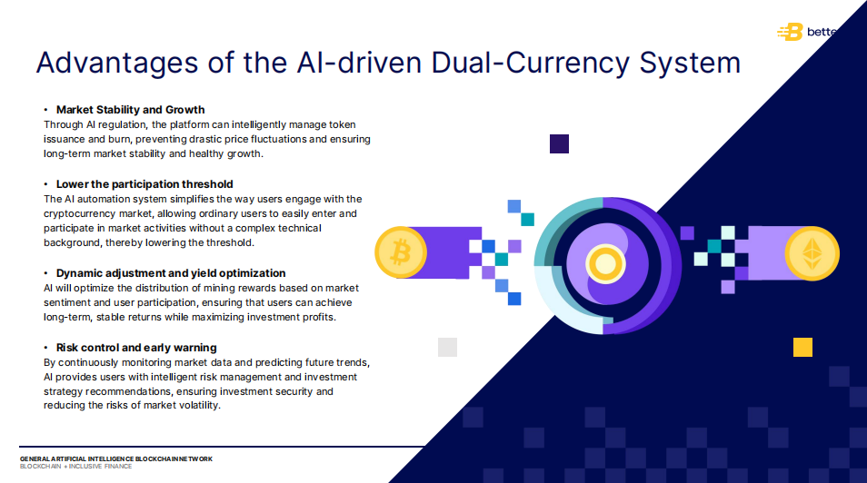 The Better-Pro platform adopts an innovative dual-currency system, namely BPL and BTC3 tokens, combined with AI technology to ensure the dynamic balance and long-term growth of the market. Through AI regulation, the platform can intelligently manage the supply and liquidity of tokens, ensure price stability and optimize the user's profit experience.